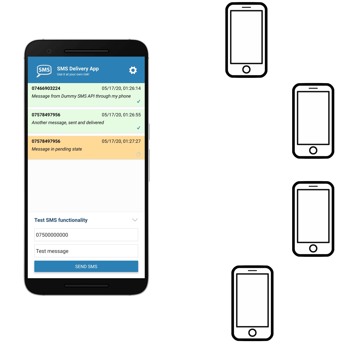 Once done, you can send messages using any HTTP client of your choice. Messages are delivered to your phone running the app and sent as SMS using your phone's native SMS capability and text credit (mostly free). As a bonus you also get delivery reports if your phone supports delivery feedback.